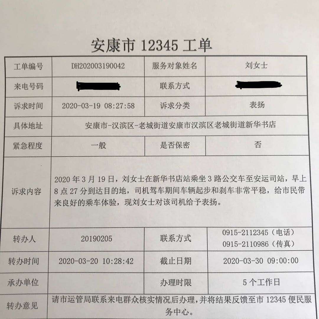 3路公交途經(jīng)地區(qū)路況復(fù)雜,客流量大,但駕駛員喻祥根師傅在當(dāng)班期間,用自己嫻熟的技術(shù)和優(yōu)質(zhì)的服務(wù)為乘客帶去了愉快的乘車體驗(yàn)。為此乘客劉女士特通過12345服務(wù)平臺表達(dá)自己的敬意。