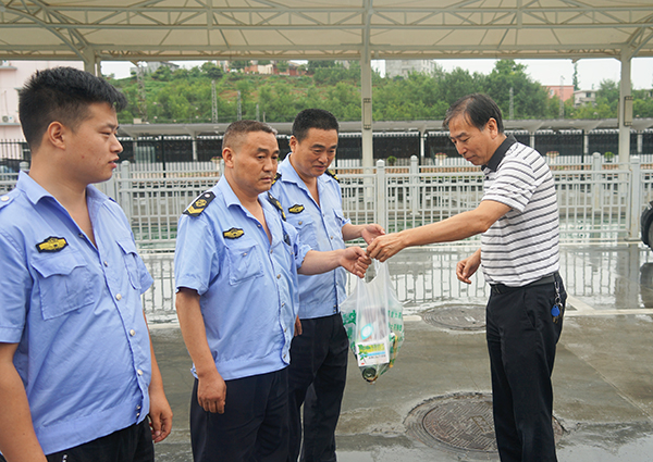 7月17日,市公交公司黨委書記、董事長(zhǎng)張曉強(qiáng)、總經(jīng)理熊衛(wèi)軍、黨委副書記錢萬輝一行為一線職工送去“夏日清涼”和關(guān)懷,讓他們?cè)诰€路上感受“涼爽”,不斷提升公交運(yùn)營(yíng)服務(wù)質(zhì)量。